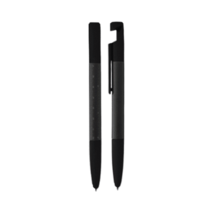 6-in-1 multi-functional twist pen in aluminum with blue ink. Functions as a ballpoint pen, touch stylus, ruler, screen cleaner, phone holder, and screwdriver. Size: 15.5 cm. Packaging: Polybag.