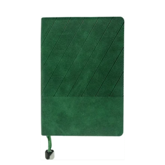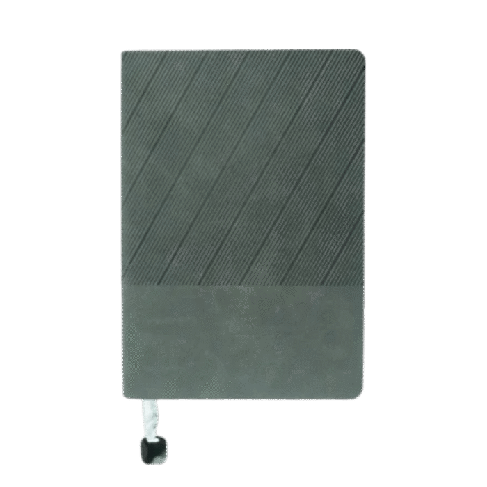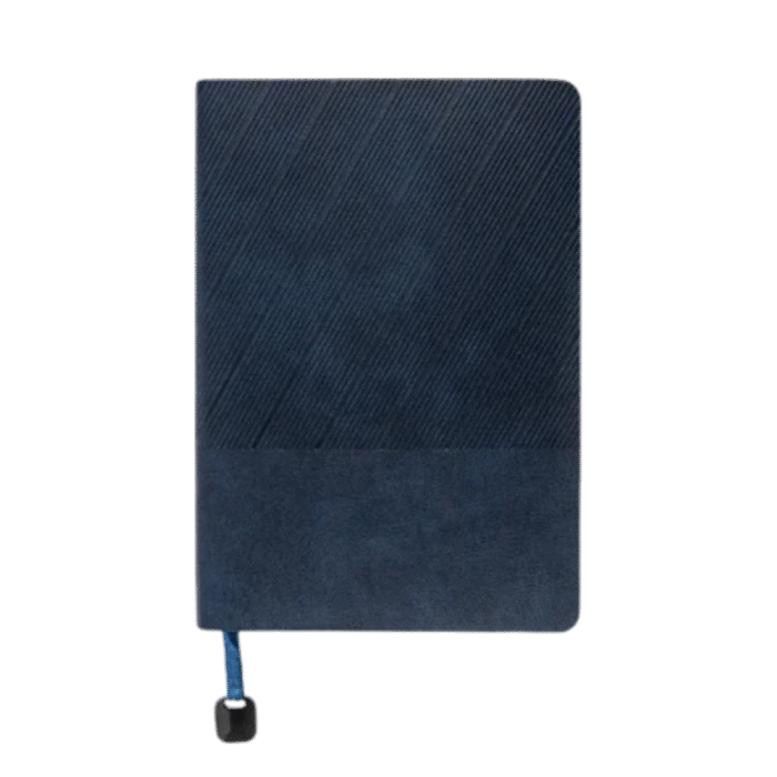 Premium A5 notebook featuring a soft, two-toned PU leather cover with a textured design. It includes 140 lined cream pages (70gsm) and a ribbon bookmark with a gunmetal-finish metal plate for branding.